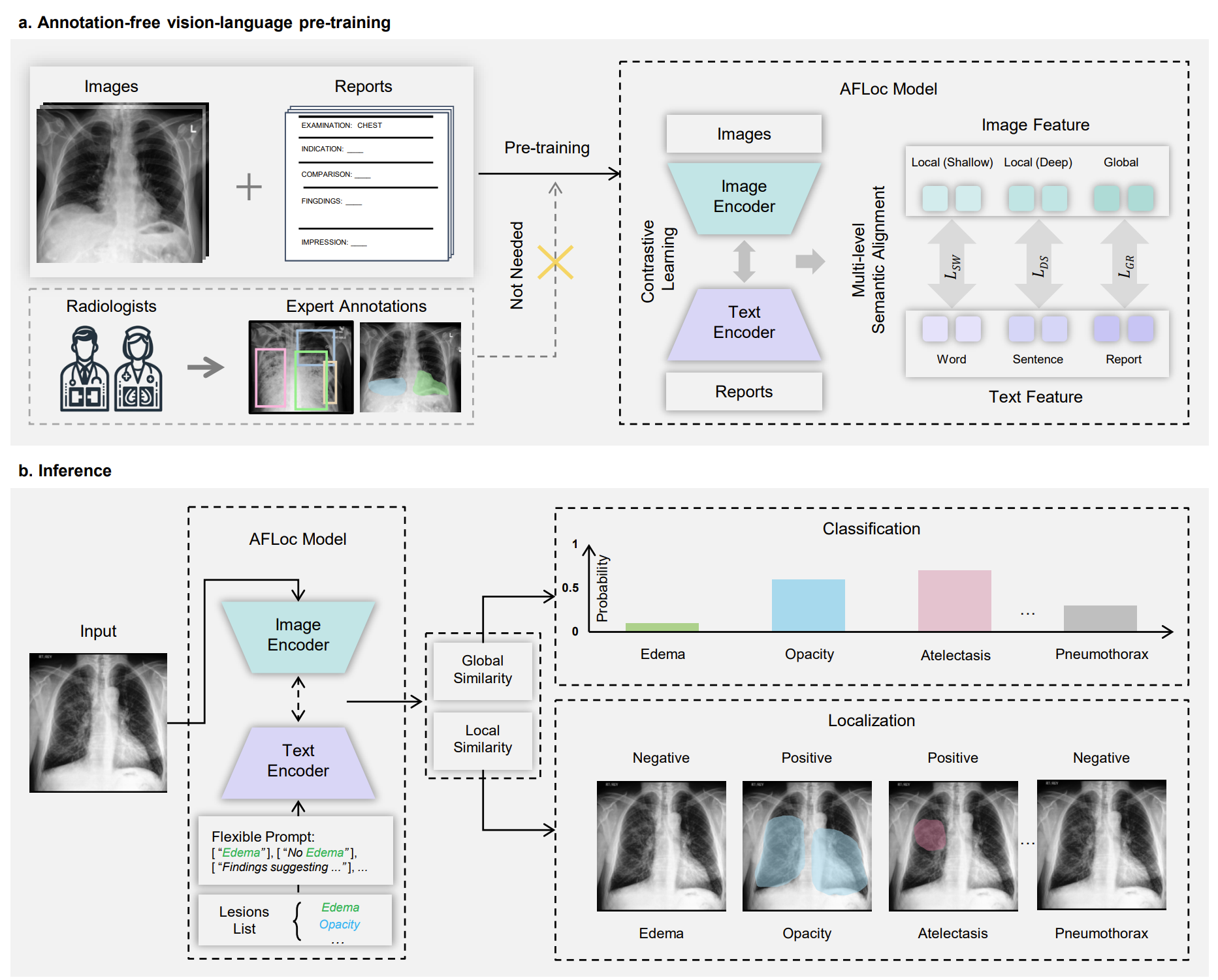 Schematic illustration of the multi-level semantic alignment during pre-training and the zero-shot inference pipeline of AFLoc. (Image by SIAT)